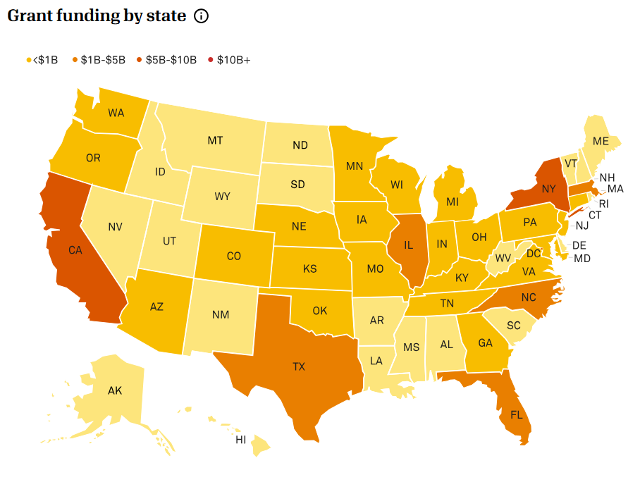 In this infographic that shows grant funding by states, nonprofits in states where grant funding is less than $1B might not have as much success as those where it’s greater than $10B.