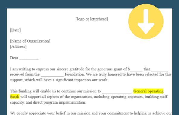 We’ve created two free templates for thank you letters to funders you can use to launch your acknowledgement process:
