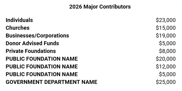 - Historic revenue in each category (individuals, churches, businesses/corporations, foundations, etc.).