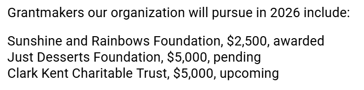 Once you’ve calculated the total amounts for each category and listed those in your major contributors list, you want to highlight the specific foundations and government entities you will approach for funding this year. List the grantmakers you plan to apply to and the respective amounts you will request, and note any requests that are already awarded or currently pending. Your grants list might look like this: